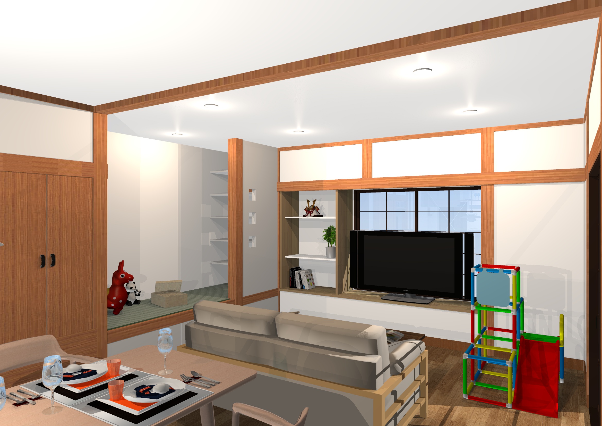 小上がりにすることで、ちょっと腰掛けたり、お子様の遊び場・読書スペースになったりと、